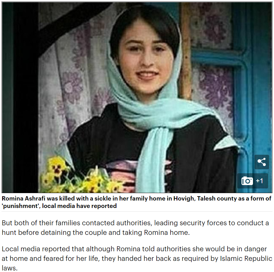 Menggunakan sebilah sabit Menerusi laporan Mirrorcouk remaja perempuan yang dikenali sebagai Romina Ashrafi. Were appalled that the Iranian authorities repeatedly ignored Rominas pleas for protection from her violent and abusive father. Her murder came just two weeks after the beheading of 14-year-old Romina Ashrafi from Talesh northern Iran who was killed by her father using a sickle after she attempted to elope with her 35.